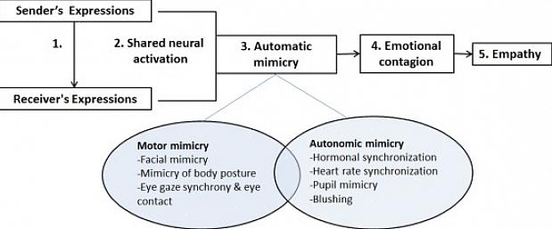 העברה רגשית היא תהליך פרימיטיבי, לא מודע, שקשור רבות להישרדותנו כמין. המנגנונים הם חלק מריקוד רגשי שאנשים משתמשים בהם כדי להסתנכרן זה עם זה, על ידי העתקת הבעות פנים. הכל מתחיל בחיוך, מבט כועס או דמעות. כל מה שצריך זה לראות מישהו מביע רגש כדי שתתחיל להראות סימנים של אותו רגש בדיוק.