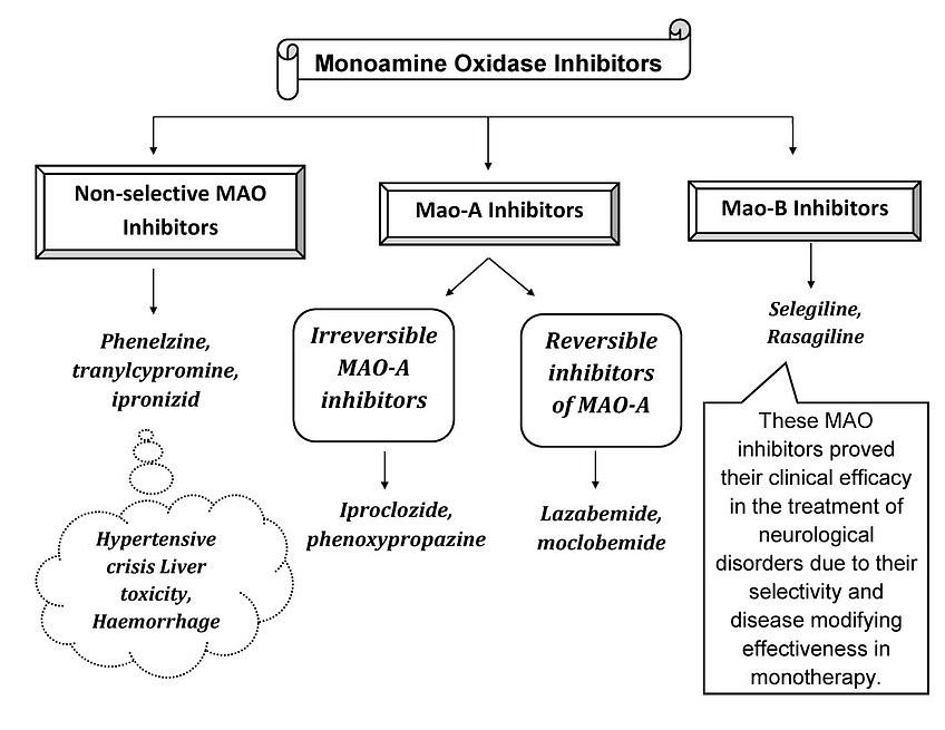 במובן זה, תרופות נוגדות דיכאון מסוימות פועלות כמעכבי מונואמין אוקסידאז (MAOI). זהו אנזים הכרחי לקטבוליזם של מונואמינים.