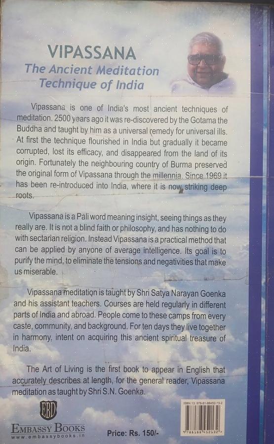 זוהי גם אחת מטכניקות המדיטציה העתיקות ביותר בהודו. זהו נתיב משתנה המבוסס על התבוננות עצמית והתבוננות. ויפאסנה מורכבת משימוש במוחנו כדי למצוא את התשובות לשאלות הגדולות המשפיעות עלינו. חלק מהשאלות הללו הן: מי אני? איך אני יכול להשתחרר מהסבל שלי? מה הקשר שלי עם העולם?