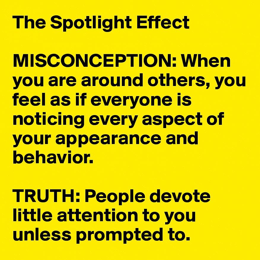 לכן, כשאתה מוצא את עצמך חושב שכולם מסתכלים על משהו שעשית עכשיו, שאל את עצמך אם זה רק בגלל שאתה אובססיבי למעשים שלך. האמת היא, שכל האנשים האחרים שאתה חושב שמסתכלים עליך בעצם דואגים להתנהגות שלהם וחושבים שאחרים שמים לב אליהם יותר מדי!
