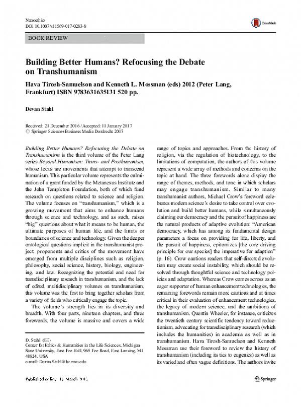 טרנסהומניזם הוא תנועה חברתית-פוליטית, אינטלקטואלית, פילוסופית ומדעית הדוגלת בשימוש בטכנולוגיה כדי "לשפר" את האדם. שיפור כזה, הרצון הזה לייעל את היכולות האנושיות לגבולות בלתי צפויים, יפנו את מקומם לפוסט אנושיים. זה רעיון מפחיד שהולך ונהיה יותר ויותר פופולרי. למעשה, סימפוזיונים, כנסים ומחקרים בנושא זה נמצאים במגמת עלייה.