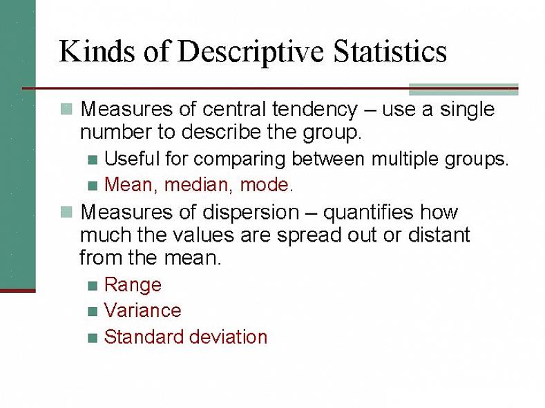 בינתיים, סטטיסטיקה תיאורית היא אותו חלק מהסטטיסטיקה שאחראי לאיסוף, הצגת ואפיון של סט נתונים. במילים אחרות, סטטיסטיקה תיאורית מתכוונת לדעת מה קרה, בהשוואה לסטטיסטיקות מסקנות שמנסות לחזות מה יקרה בעתיד בסט של תנאים.