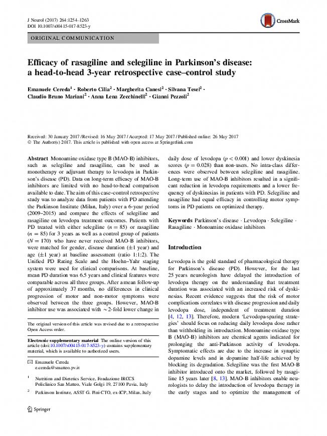 מחלת פרקינסון היא אחת המחלות הנוירודגנרטיביות הנפוצות ביותר. Rasagiline, הידוע גם בשם המותג Azilect, הוא טיפול תרופתי יעיל ביותר למצב זה. זה דומה לסלגילין, והוכח כמשפר את התפקוד המוטורי של המטופל תוך יום אחד לאחר תחילת הטיפול.