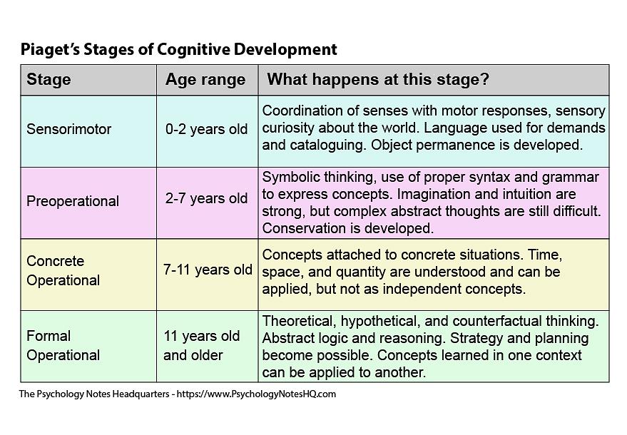פיאז'ה תיאר שלושה שלבי התפתחות קוגניטיביים כלליים.
