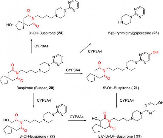 Buspirone פועל בעיקר כאגוניסט חלקי של קולטני הסרוטונין 5-ht1a. בנוסף, יש לו זיקה מסוימת לקולטני 5-HT2. והוא גם פועל כאנטגוניסט חלש של קולטני הדופמין D2.