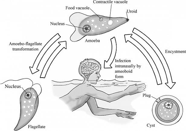האמבה חודרת לגוף שלך דרך האף. כאשר אתה צולל או האף שלך בא במגע עם מים מזוהמים, האמבה נכנסת ומגיעה למוח שלך. הזיהום מתרחש תחילה ברמת רירית האף ומשם עובר לעצב הריח. לאחר מכן, הוא עובר דרך שכבת המסננת, שם הוא מגיע אל נורות הריח של מערכת העצבים המרכזית (CNS).