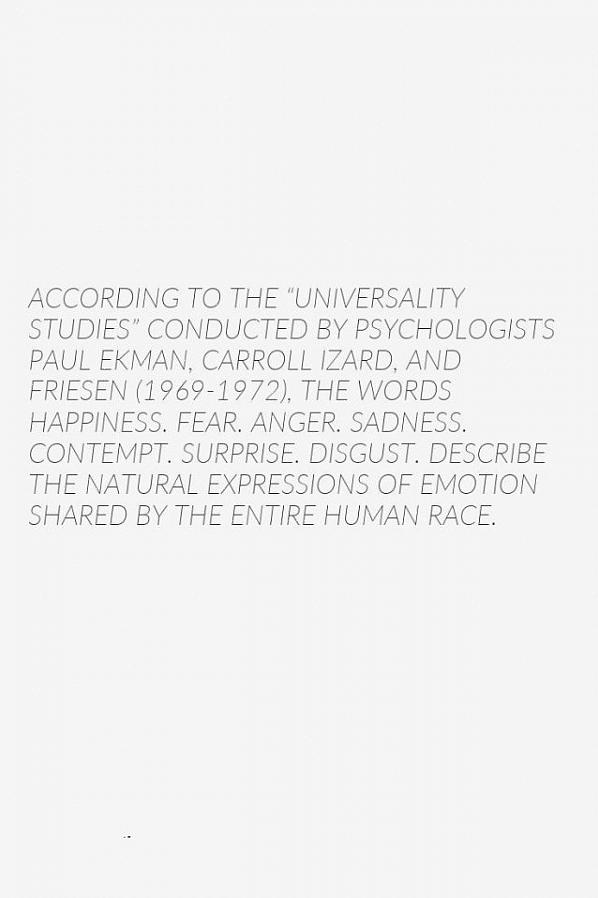 בתחילה, אקמן האמין שיש שש מחוות או ביטויים אוניברסליים לשישה רגשות אוניברסליים: פחד, כעס, שמחה, עצב, גועל והפתעה). מאוחר יותר, הוא הרחיב את הרשימה ל-17. לאחר מכן הוא פיתח את מערכת קידוד פעולות הפנים (FACS) כדי לסווג את כל ההבעות האנושיות שאנו יכולים איכשהו לזהות בפנים שלנו.