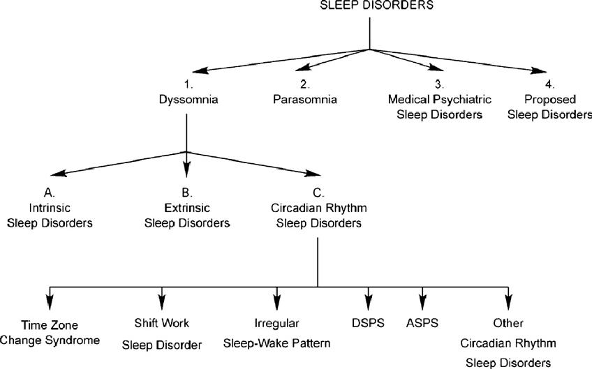 - הפרעה מתמשכת או חוזרת בשינה. דפוס הנובע משינוי במערכת הצירקדית או מחוסר התאמה בין המקצב הצירקדי למקצב הצירקדי האנדוגני וסנכרון ער-שינה הכרחי. זה יכול להיות קשור לסביבה הפיזית של אדם או ללוחות הזמנים החברתיים או המקצועיים שלו.
