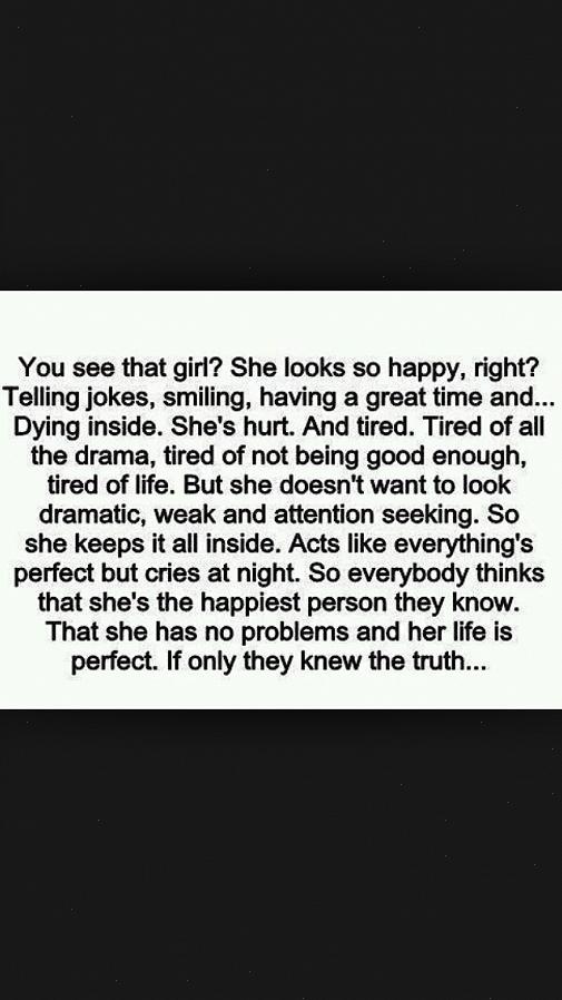 אבל המחשבות שיש לי הן לא בדיוק הבריאות בעולם. אני חושב שאני רמאי, אדם חסר תועלת שלא עושה שום דבר נכון, שהעתיד לא טומן לי תקווה כי אני כלום. העולם הוא מקום אפל שמאיים כל הזמן להראות לי כמה מעט אני שווה. לפעמים, אפילו חשבתי לסיים את כל הסבל שלי, אבל אין לי כוח לעשות זאת. כמו כן, אני יודע שעמוק בפנים זה לא יתקן כלום.