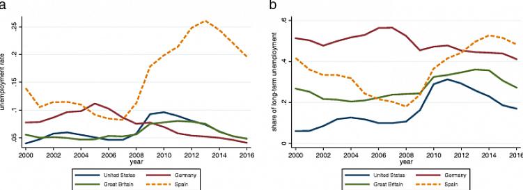 במחקר אחד, חוקרים גילו שכאשר מישהו הפך למובטל, רמת הרווחה שלו ירדה באופן דרסטי והחרדה שלו עלתה. לאחר מכן הם נוטים להתייצב לזמן מה, ולאחר מכן, הרמות שלהם מזנקות שוב כאשר אבטלה ארוכת טווח מתחילה.