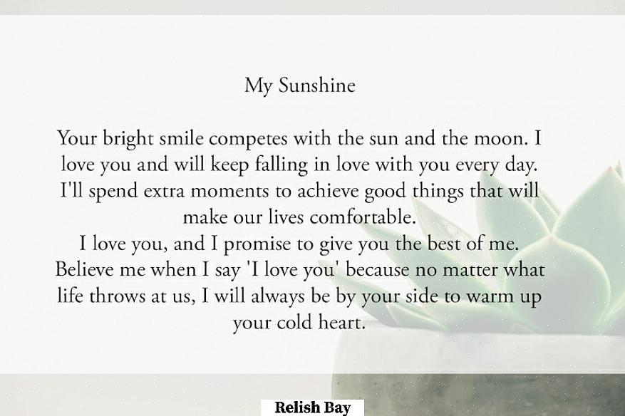 אתה ההשראה הגדולה ביותר שלי ואני רוצה שתהיה חלק מההחלטות והרצונות שלי לנצח. תן לאהבה שלנו לצמוח ללא גבולות והגבלות כי כך בנינו אותה מההתחלה. לכן, למרות שלפעמים אני שוכח לומר לך, אני אוהב אותך.