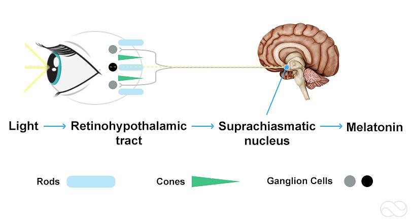 - פיגמנט זה ותאיו נושאים מידע ישירות לגרעין העל-כיאסמטי. מאוחר יותר, לאחר ניתוח המידע, הוא ישלח אותות לגרעיני צוואר הרחם העליון. אותות אלו יגידו לבלוטת האצטרובל או לאפיפיזה להפריש או לעכב ייצור מלטונין.