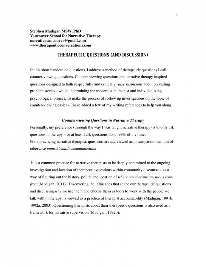 החידוש של הגישה הנרטיבית הוא בכך שהיא מספקת רצף שימושי של שאלות המייצרות באופן עקבי אפקט משחרר עבור אנשים. לעקוב אחר הרצף הטיפולי הזה זה כמו לבנות קשת לבנה אחר לבנה. אם תנסו להגיע למדרגה האחרונה מבלי שתכניסו בסבלנות את הלבנים הראשונות, הקשת לא תחזיק.