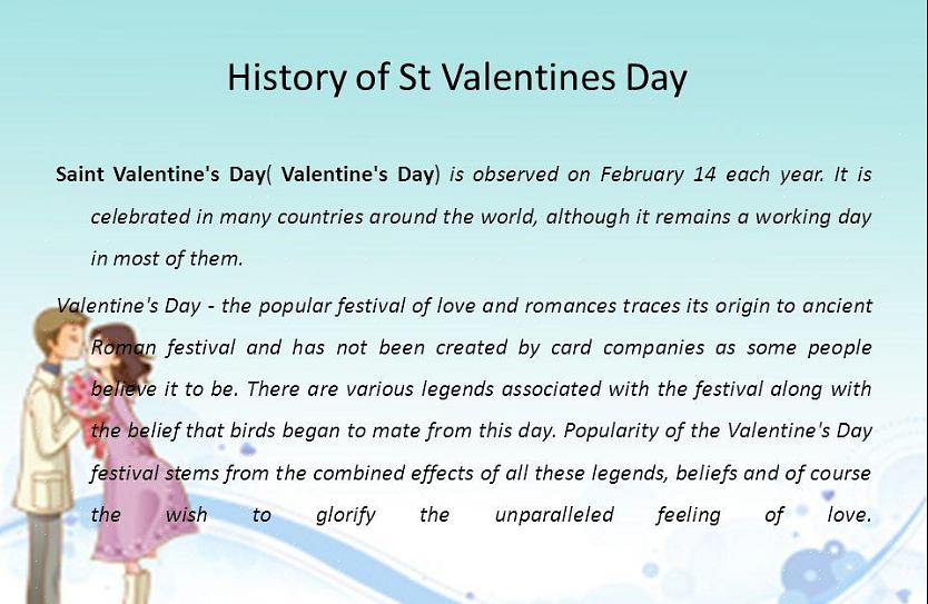 לכן, הדוכס מאורלינס שלח לאשתו מכתב עם שיר רומנטי בזמן שהיה כלוא במצודת לונדון במהלך קרב אגינקור. כפי שאתה יכול לראות, חגיגת החג הזה כוללת שורה של סיפורים והמסורות נמשכו לאורך מאות שנים.