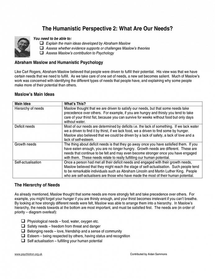 תיאוריית המימוש העצמי של מאסלו טוענת שאדם הוא שלם משולב ומאורגן. הוא גם האמין שלכל אדם יש כמה צרכים היררכיים שהם צריכים לענות עליהם. אלו הם צרכים פיזיולוגיים, צרכים רגשיים וצרכי מימוש עצמי. הוא ארגן אותם בצורה של פירמידה. בבסיס הפירמידה נמצאים הצרכים הפיזיולוגיים. לאחר מכן, הצורך בבטיחות, צרכים רגשיים והערכה עצמית. למעלה אתה עולה, עד שאתה מגיע למימוש עצמי, שנמצא בראש הפירמידה. מאסלו האמין שמטרת הטיפול צריכה להיות שילוב האדם כאדם.