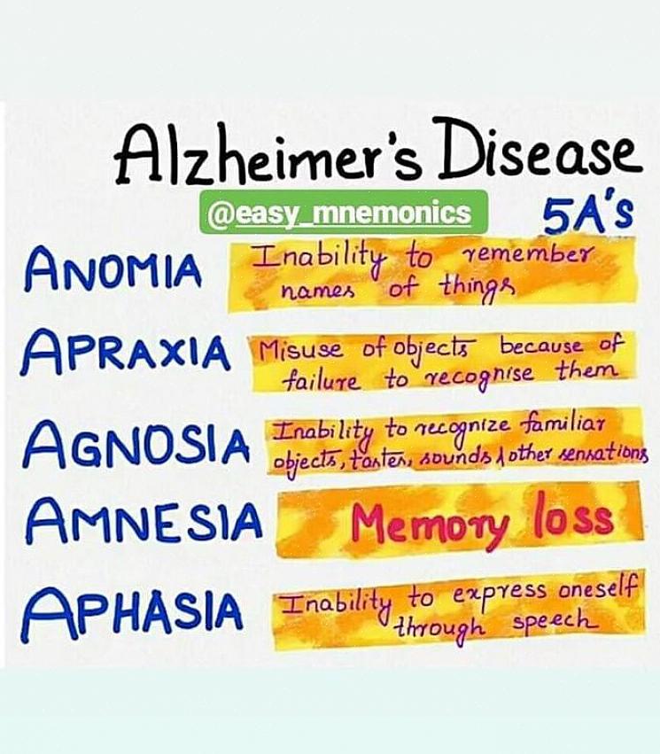 - מוטורי: קושי לזכור ולבצע תנועות נלמדות. ידוע גם בשם אפרקסיה. למשל, לנסות לשים חולצה על הרגליים במקום על הגו.