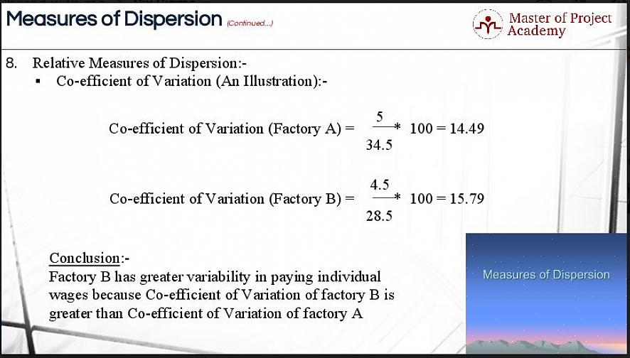 מקדם הווריאציה הוא המייצג ביותר מכל מדדי הפיזור שדיברנו עליהם כי הוא נותן לך מספר מופשט. במילים אחרות, זה לא תלוי במשתנים בקבוצות שלך. בדרך כלל תראה את מקדם השונות מוצג כאחוז (3).