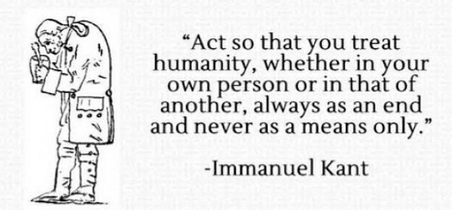 לדוגמה, אתה יכול לקבל מבקרים אם הם מביאים כסף לבזבז ולחפש שלום רק אם זה יקר יותר ממלחמה. כמו כן, אתה יכול להמר על האמת אבל רק בגלל שהיא משתלמת יותר משקר. למרות שקאנט מת לפני מאתיים שנה, אנשים אפילו לא התחילו להבין את המסר שלו.