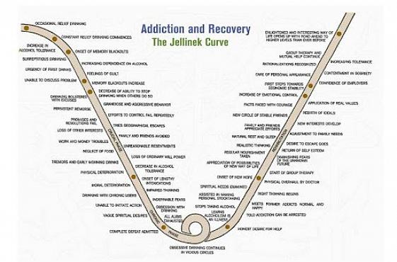 ג'לינק אישר שאלכוהוליזם מתפתח בארבעה שלבים נפרדים. אלה הם טרום אלכוהוליים, פרודרומליים, קריטיים (או קריטיים) וכרוניים, כל אחד עם סדרה של תסמינים אופייניים. להלן שלבי האלכוהוליזם: