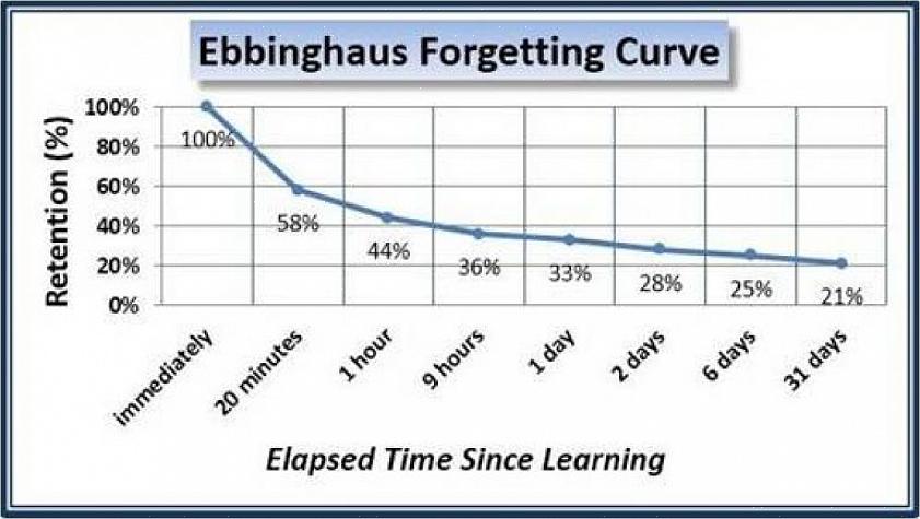 עקומת שכחה טיפוסית מראה כיצד אנו שוכחים את רוב מה שלמדנו תוך מספר ימים או שבועות. זה קורה אם אנחנו לא עובדים כדי לבדוק את המידע. הוא גם גילה שכל סקירה אפשרה לשני להיות בהמשך הקו אם אנחנו רוצים לשמור על אותה כמות מידע. אז אם אתה רוצה לזכור משהו, אולי הביקורת הראשונה צריכה להיות שעה מאוחר יותר. כך נוכל לחכות יותר לסקירה הבאה.