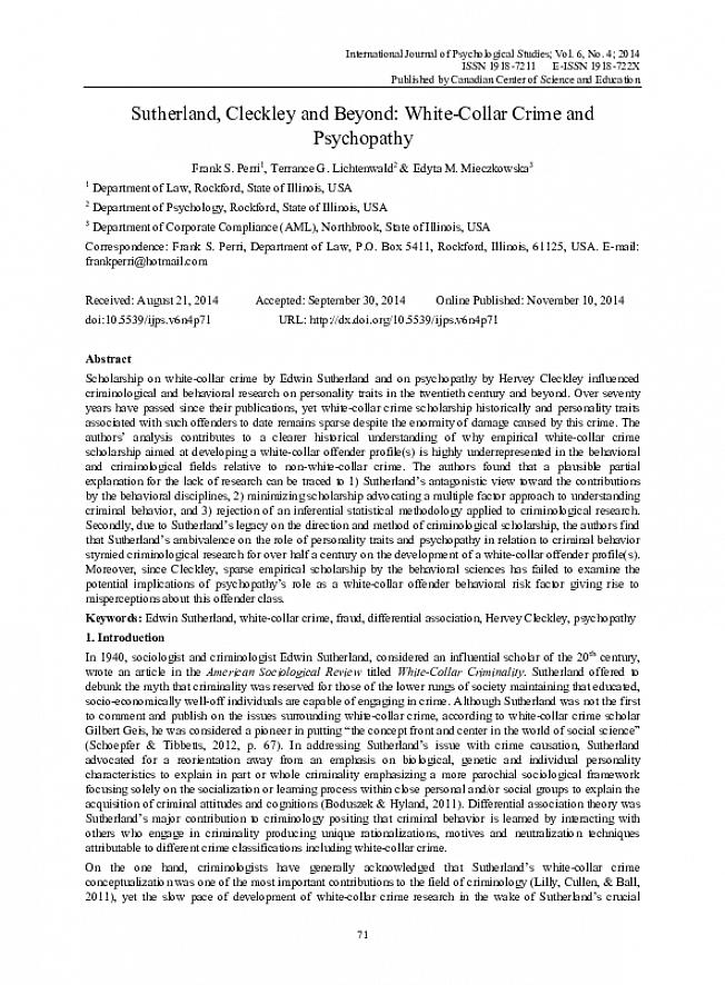 ברוב החברות, פשעים מסוג זה נעשו מאז ימי קדם. למען האמת, בוצעו מחקרים שונים בנושא. עם המחקר הזה, הם קבעו שהפרופיל המאפיין את פושע הצווארון הלבן תואם, ברוב המקרים, לזה של פסיכופת.