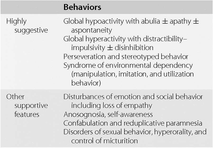 הסימפטומים המפורטים נוטים להופיע בתחלואה נלווית עם פגיעות מוחיות באונה הקדמית, במיוחד בקליפת המוח הקדם-מצחית. אבל מחקר נוירופסיכולוגיה אפשר לנו להבין את הקשר הספציפי יותר בין התסמינים על סמך המבנה הפגוע: