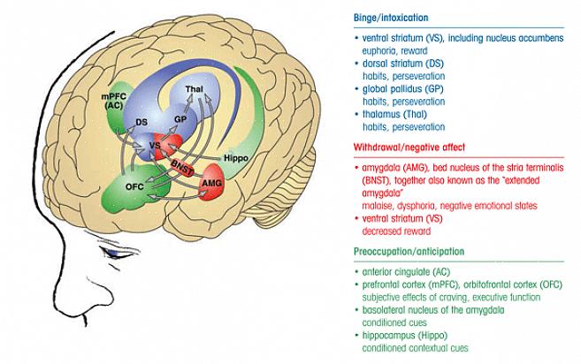 חלק מהמומחים מגדירים התמכרות כמעגל בעל שלושה שלבים: בולמוס/שכרון, התנזרות/רגשות שליליים ודאגות/ציפייה (חרדה). השלב האחרון מחמיר עם הזמן וגורם לשינויים נוירופלסטיים במרכז התגמול של המוח, מתח ומערכות תפקוד ביצועי. (2-4).