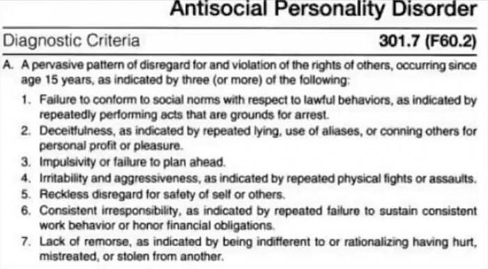 - דונלד טראמפ לא אוהב חוקים, פרוטוקול, ביקורת או התנגדות. לעתים קרובות הוא מערער על הסטטוס קוו והוא אינו מקבל פקודות. אם נוסיף את האימפולסיביות שלו להתנהגויות אלו, יש לנו מה שמסווג על ידי ה-DSM-5 כהתנהגות אנטי-חברתית.