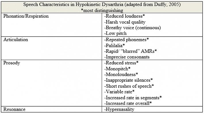 - דיסארטריה רפה. מאופיין בבעיות בטונוס ובתנועת השרירים הפונטורית.