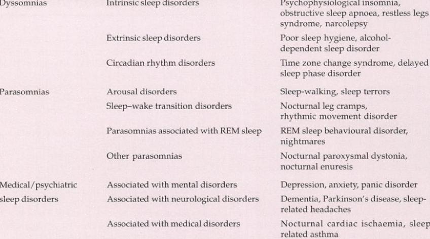רופאים מגדירים הפרעות שינה עיקריות כאלו שאינן קשורות למצב רפואי מסוים. הפרעות אלו מאופיינות בבעיות עם: