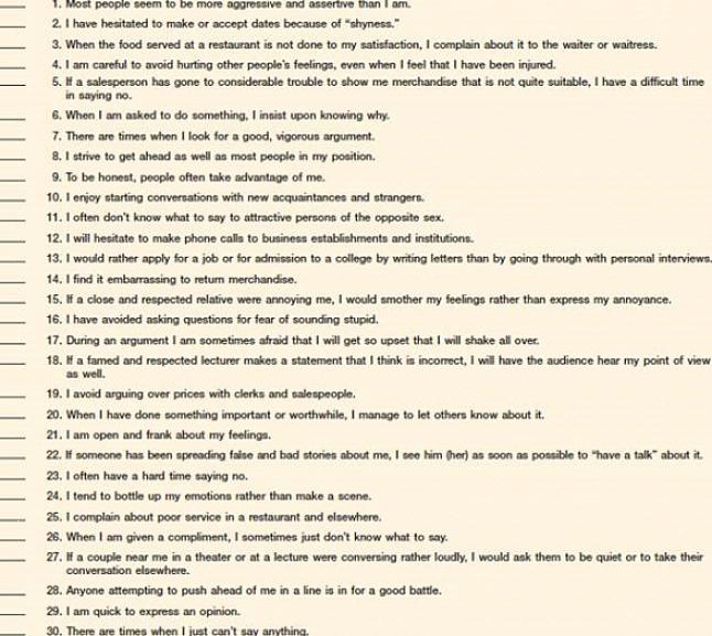 סולם Rathus מורכב מ-30 שאלות עם 6 תשובות אפשריות, ממאפיינת אותי עד מאוד לא אופיינית. השאלות, המשוחזרות כאן מ-rathus, 1973, הן: