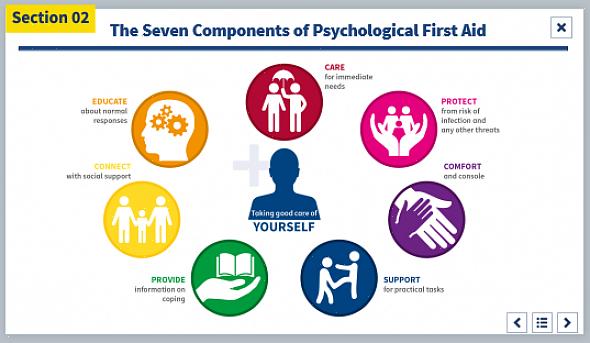 עזרה ראשונה פסיכולוגית תורמת למזעור ההשפעות של משבר. התפקיד העיקרי שלך, ללא ספק, הוא לוודא שהנפגע מקבל את הטיפול הדרוש לו מאיש מקצוע. העבודה שלך מוגבלת ל"זמן כרגע" ויש לספק ולהבין באופן זה. המפתח הוא להיות איש קשר.