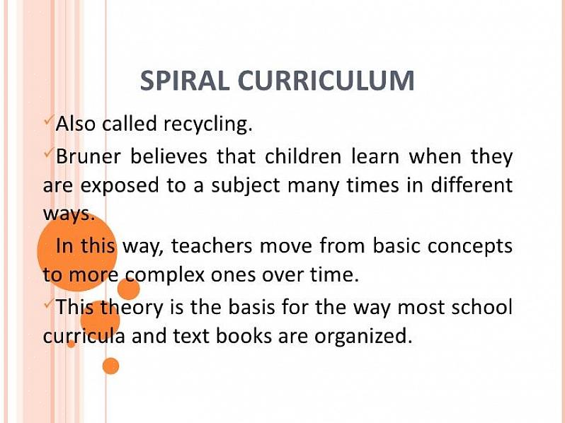 תכנית הלימודים הספירלית מתייחסת ללמידה באופן שבו התלמידים יכולים לעבור מידע כללי לידע מיוחד. הדרך שבה הוא משיג זאת היא על ידי למידה מתמשכת, שכן היא מונעת ממושגים ליפול בקלות לשכחה.