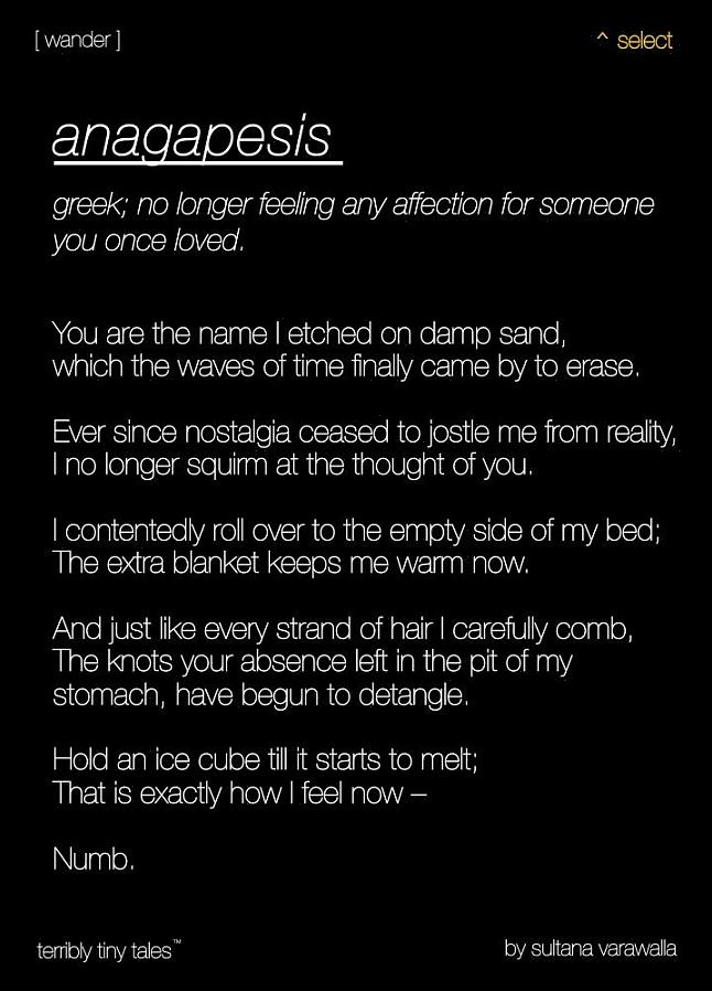 "לפעמים הנוסטלגיה כל כך גדולה שהיא הופכת ליותר מסתם תחושה. אנשים הם נוסטלגיה. זה אומר לחיות כדי למצוא עיניים של אדם אחד על כל פנים ובכל פינה בלתי סבירה בעולם. זה מבלבל את השיער שלהם, הפה שלהם, הבושם שלהם זה מחייך עם השפתיים שלך, בזמן שהלב שלך נחנק."