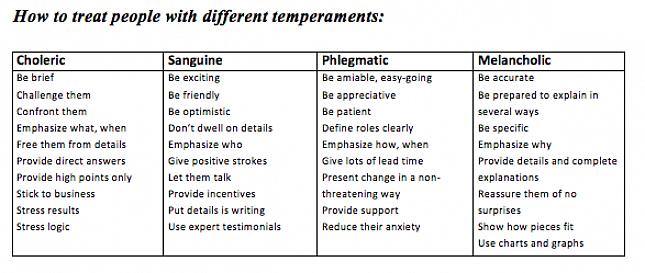 - Sanguine (דם): אנשים שמחים ואופטימיים המביעים חיבה כלפי אנשים אחרים ובטוחים בעצמם.