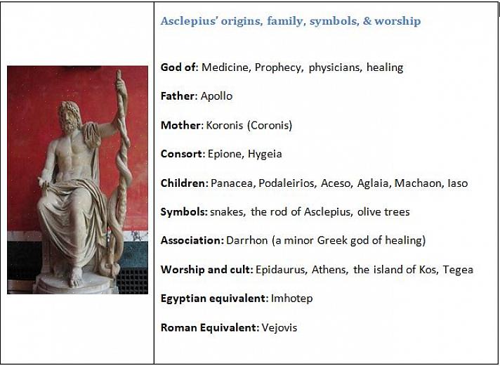 המיתוס של אסקלפיוס, אסקולפיוס עבור הרומאים, הוא לא רק על אל הרפואה אלא על משפחה שלמה המוקדשת לאמנויות הריפוי. למרות שלרוב האלים היה סוג של כוח ריפוי, אסקלפיוס היה זה ששלט בידע הזה בצורה הטובה ביותר, כמעט עד כדי יכולת לשקם את חייו של אדם לאחר מותו.